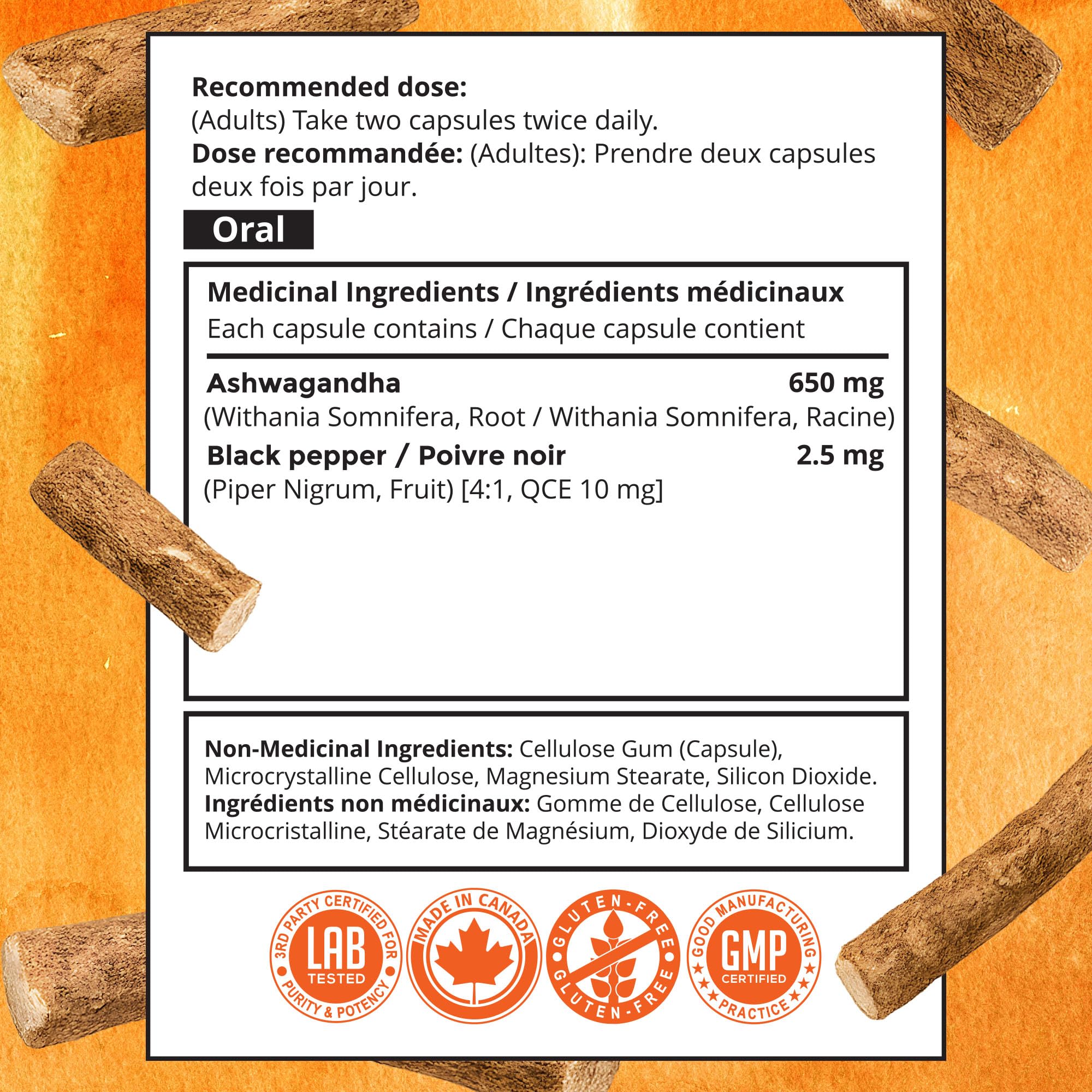 - Made In Canada - 120 vegetarian capsules of premium Ashwagandha root powder (650mg per capsule) enhanced with black pepper extract for absorption. Made in Health Canada-certified facilities following strict GMP standards.