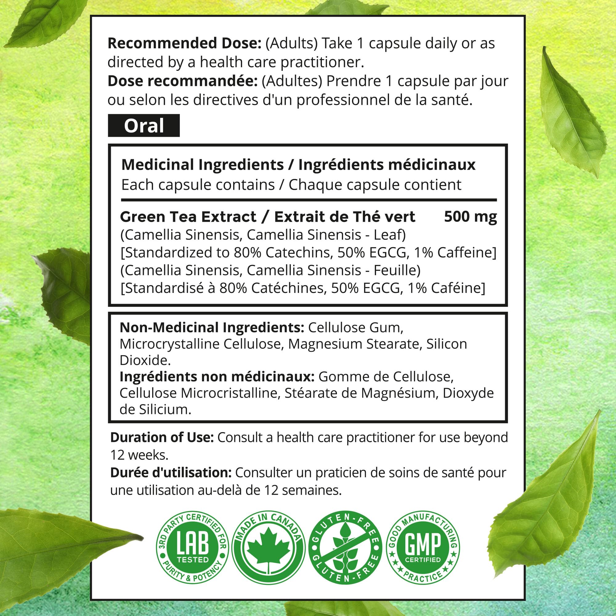 - Made In Canada - 120-day supply of premium Green Tea Extract made in Health Canada-certified facilities following strict GMP standards (NPN 80077847). Every batch is 3rd party tested for purity and potency